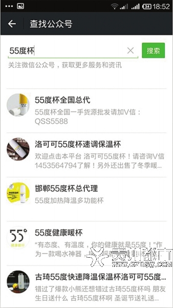 在微信上,記者隨意搜索了“55度杯”的關(guān)鍵詞,就有30余條公眾號彈出。其中很多打著全國各地代理的名頭,但基本上都沒有進行認證,還有很多添加進去后要求再加另外的微信號,這些微信號多是用于銷售物品的。